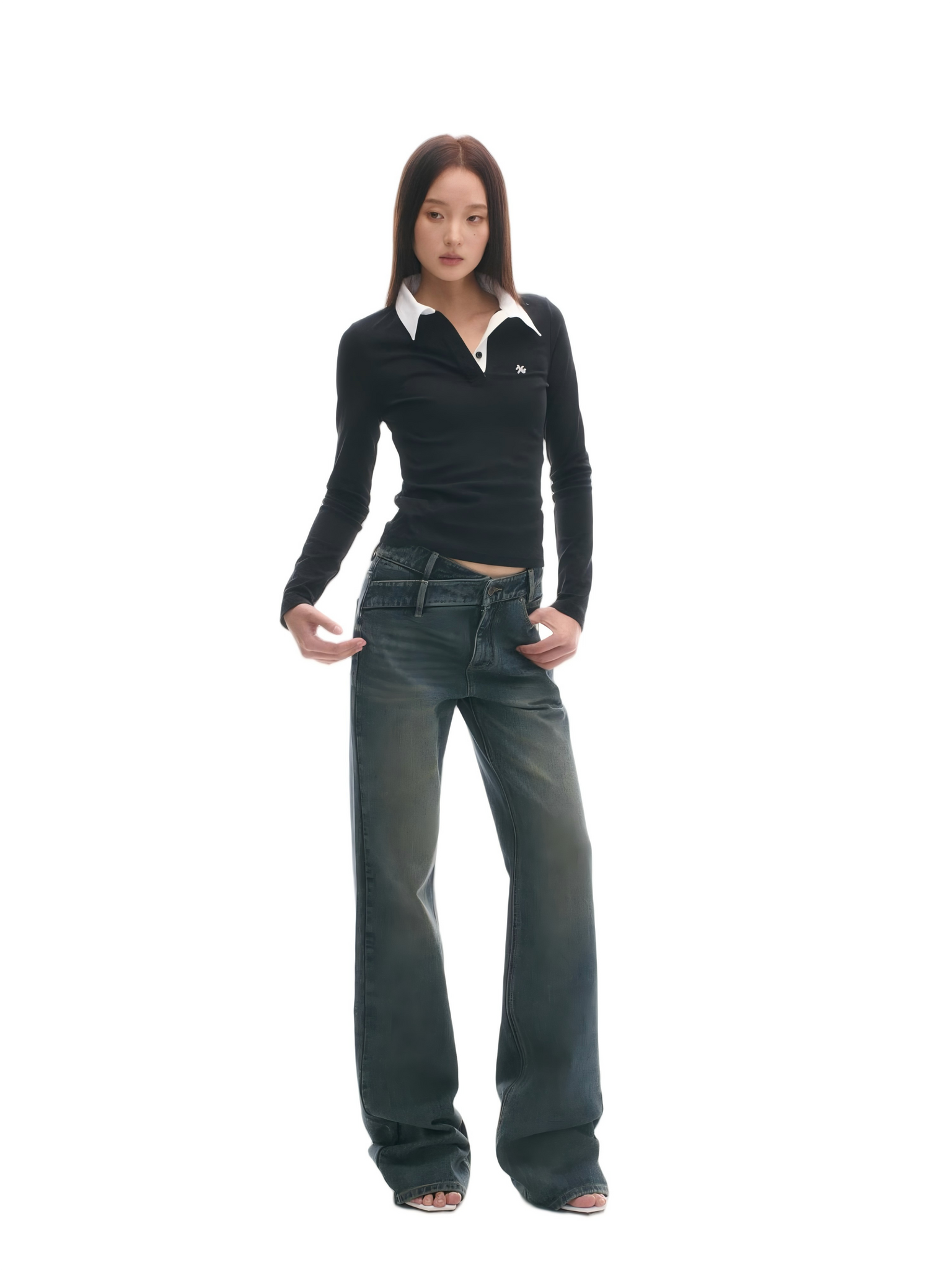 - The garment features a V-shaped crossover waistband, which gives a three-dimensional and stylish fit, and the pant silhouette is versatile and slimming